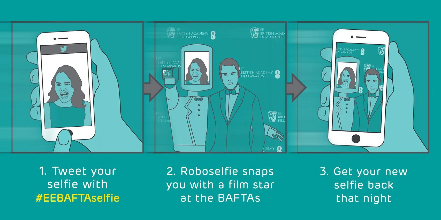 We launched with BAFTA hosts Stephen Fry and Laura Whitmore who encouraged fans to send in their selfies. Then on the night a screen on the robot’s face cycled through hundreds of fan photos in rapid succession while a camera on burst mode captured individual selfies to be sent to that person in real time.